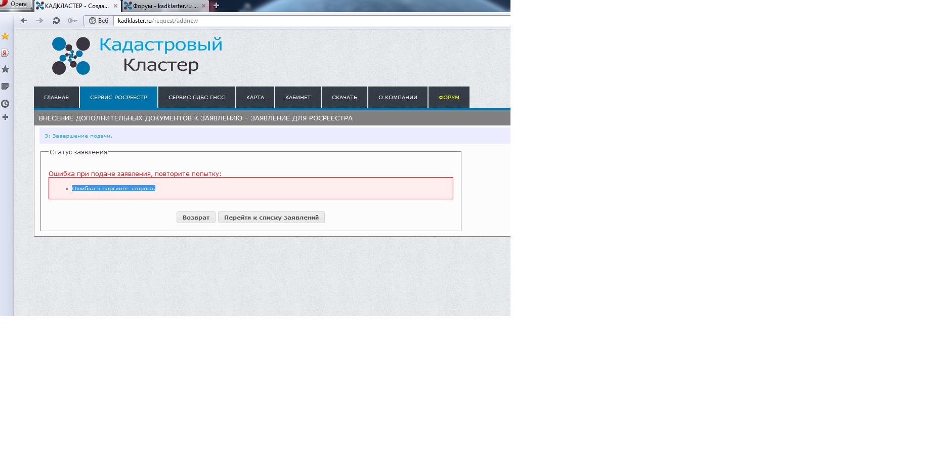 Это глюки портала. Если посмотреть заявление на портале https://rosreestr.ru/wps/portal/cc_check_request_status?requestNumber=35-1219020&check=trueТо там найдем: Заявка № 35-1219020 находится в статусе Приостановлена . Связанное заявление: 35-1253398 (О довнесении документов)Получается портал принял ваше заявление, привязал, но ответил ошибкой. В Вашем случае надо попробовать еще раз, возможно без вмешательства оператора службы технической поддержки РосРеестра не получится.