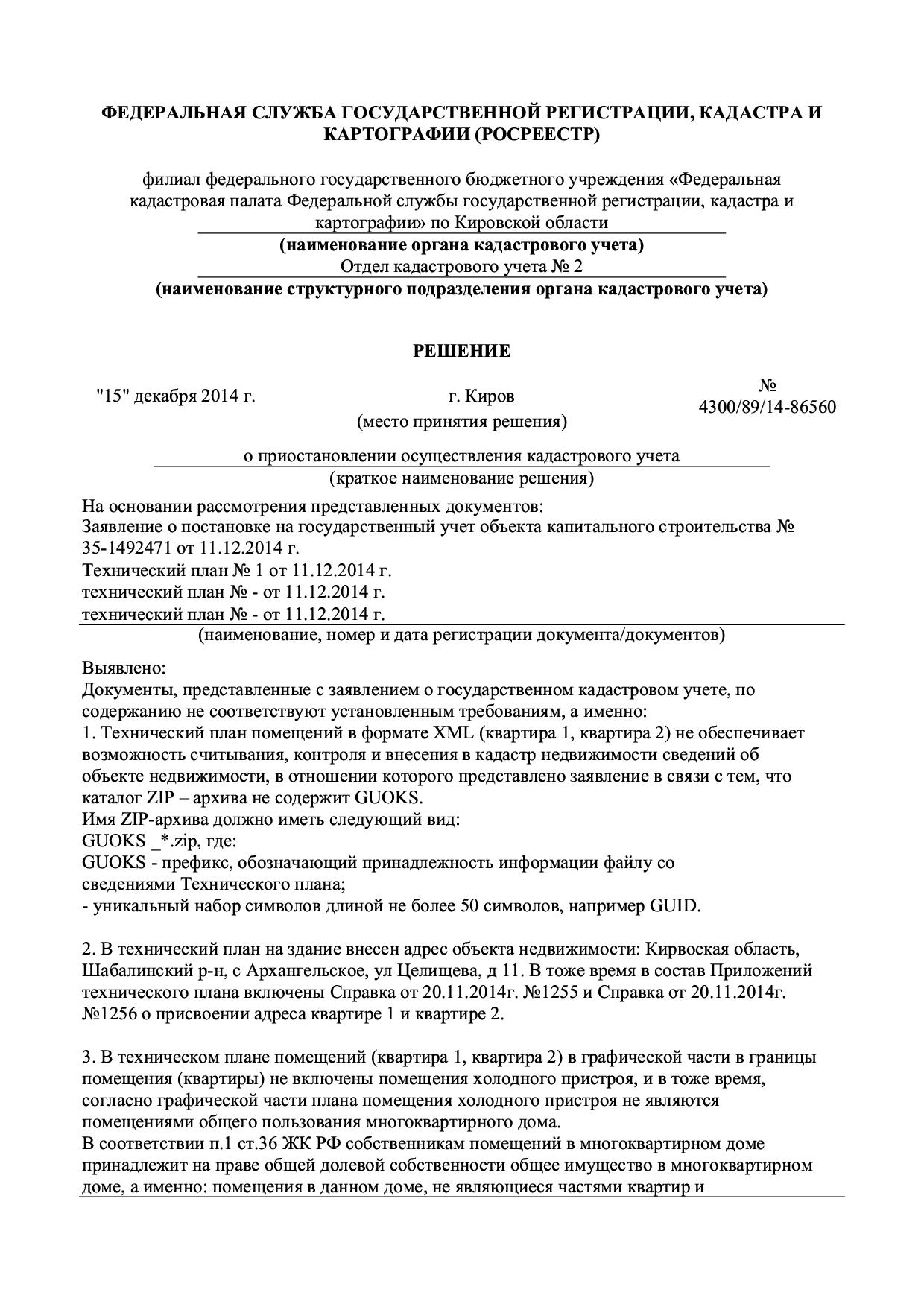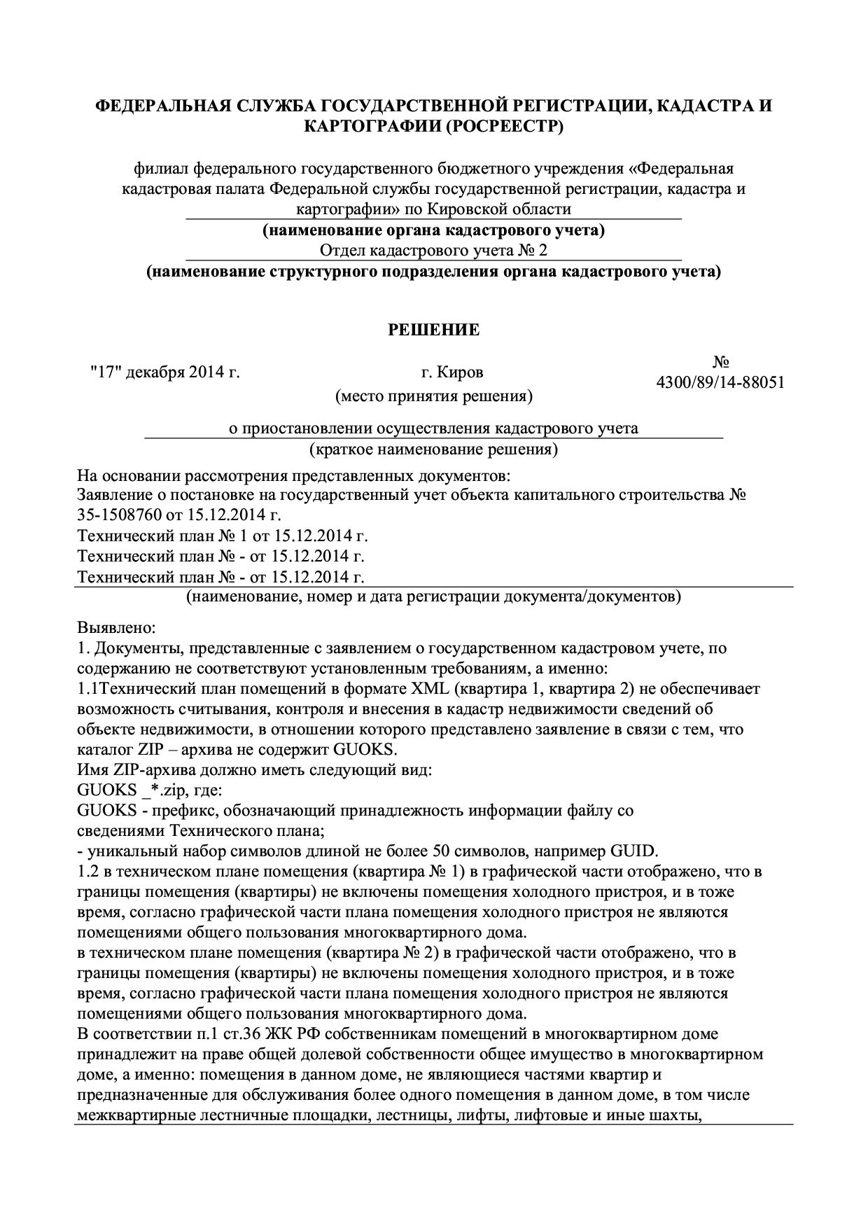 Добрый вечер! За последнюю неделю у нас возникли проблемы по пяти заявлениям(н-р, 35-1462071 и 35-1492471), поданным через кадкластер. При подаче заявления на многоквартирный жилой дом прицепляем технический план на здание и два техплана на квартиры. В кадастровой палате загружается только здание, а квартиры нет, причина - что каталог ZIP архива не содержит GUOCS. При выгрузке все было правильно. При повторной отправке уже допдокументами все проходит и загружается нормально. В чем ошибка? Отправляю Вам два Решения о приостановлении п.1, в котором говорят об этой ошибке.
