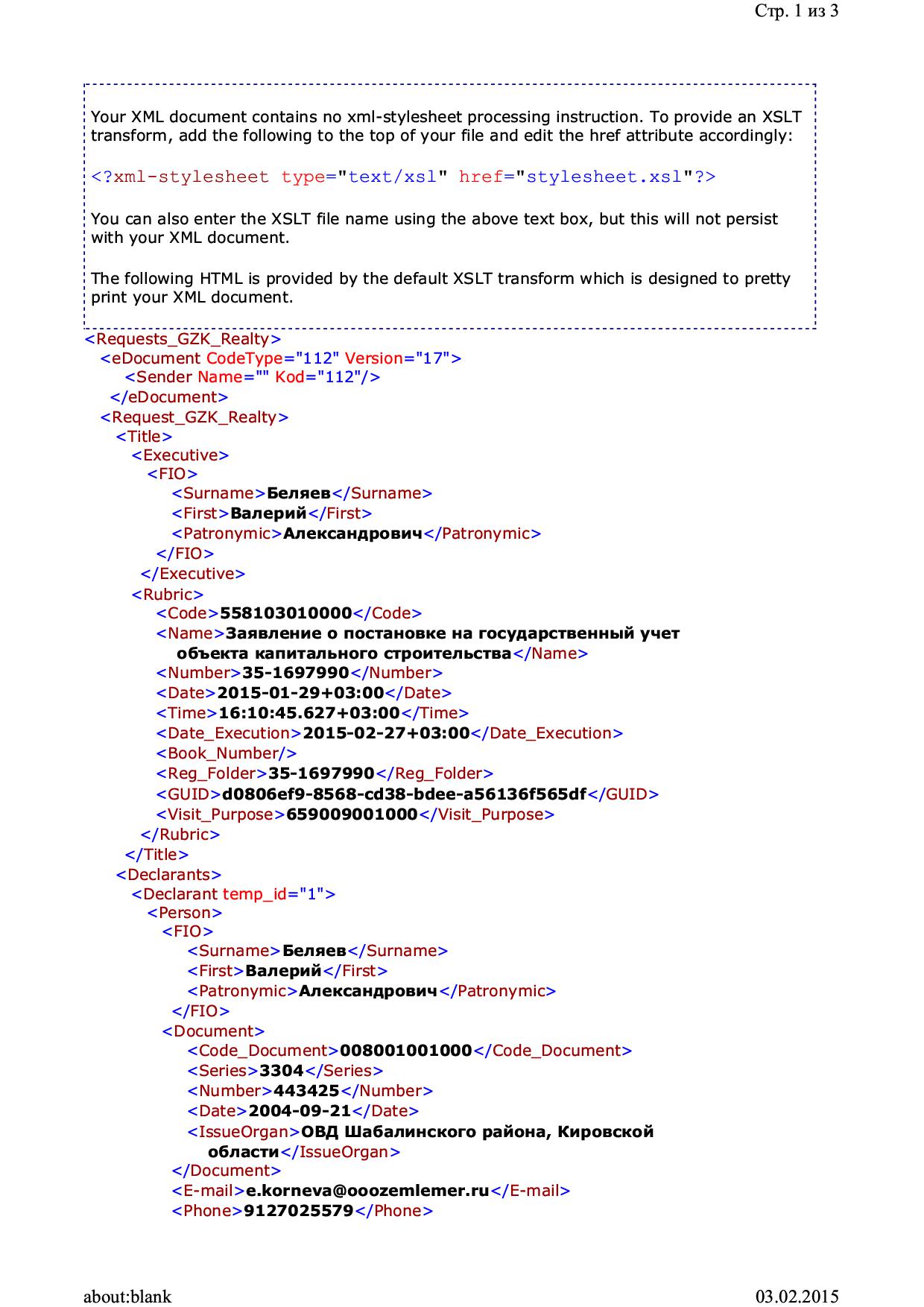 Пожалуйста, доведите эту информацию до ваших технических специалистов, возможно потребуется обратиться к разработчику ПО, с помощью которого формируется и отправляется заявление. Прикладываем образец того, что нам отправили из кадастровой палаты и просим помочь в решении данной проблемы.