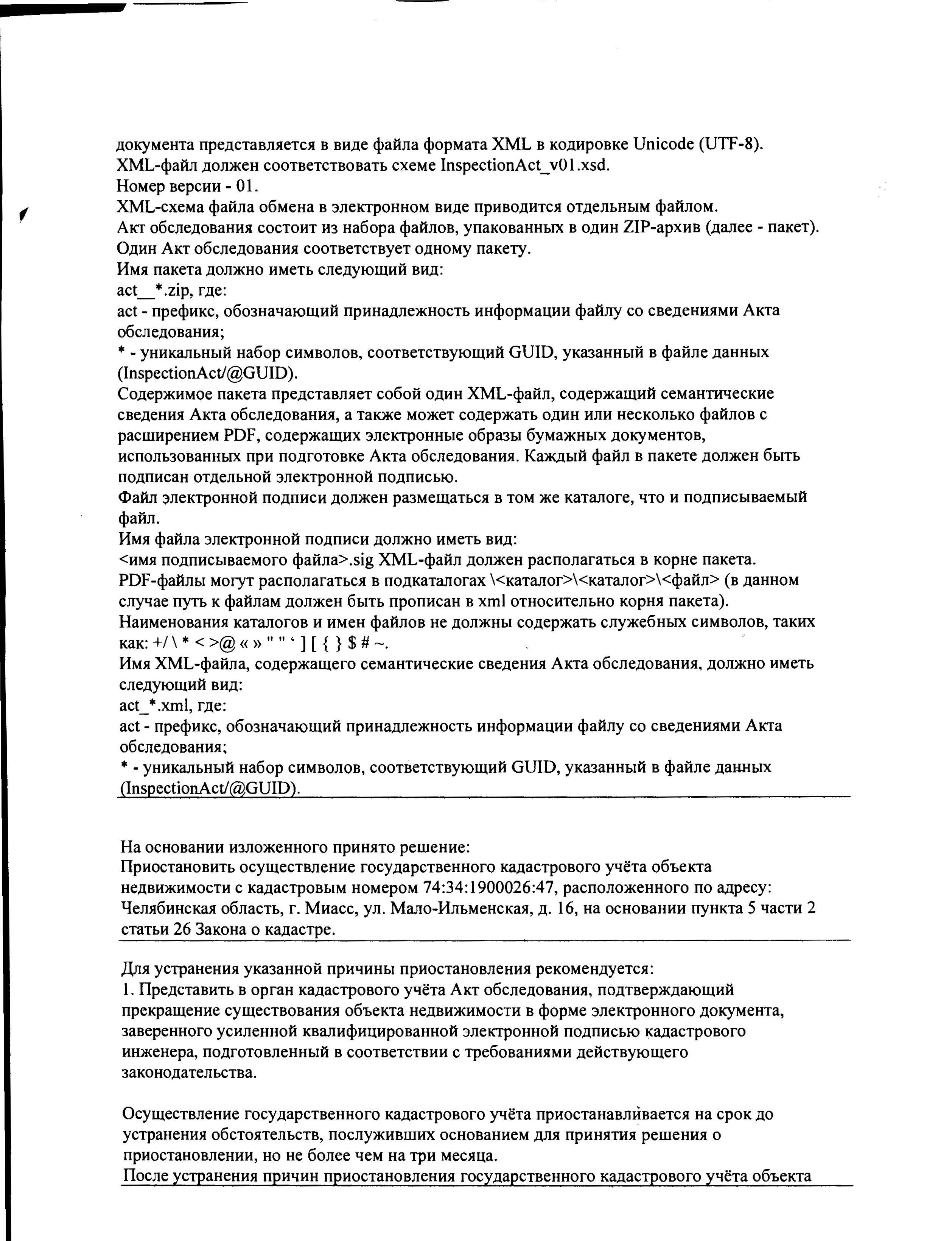 Отправляю собственника в отдел приема подавать заявление о снятии с кад учета, на полученный номерок первоначального заявления отправляю (посредством Кадкластер) дополнительное заявление с приложением акта обследования в XML формате, прилетает приостановка (текст приложен). Таких приостановок уже 3, не проходят акты обследования. Кадастровая палата утверждает что у меня неправильное наименование ЗИП архива, они видят ЗИП архив - "Акт1.zip. А я отправляю не такой файл, я то отправляю вот такой act_F8CA3B4F-4000-4A20-9215-1DDDE706C978.zip.