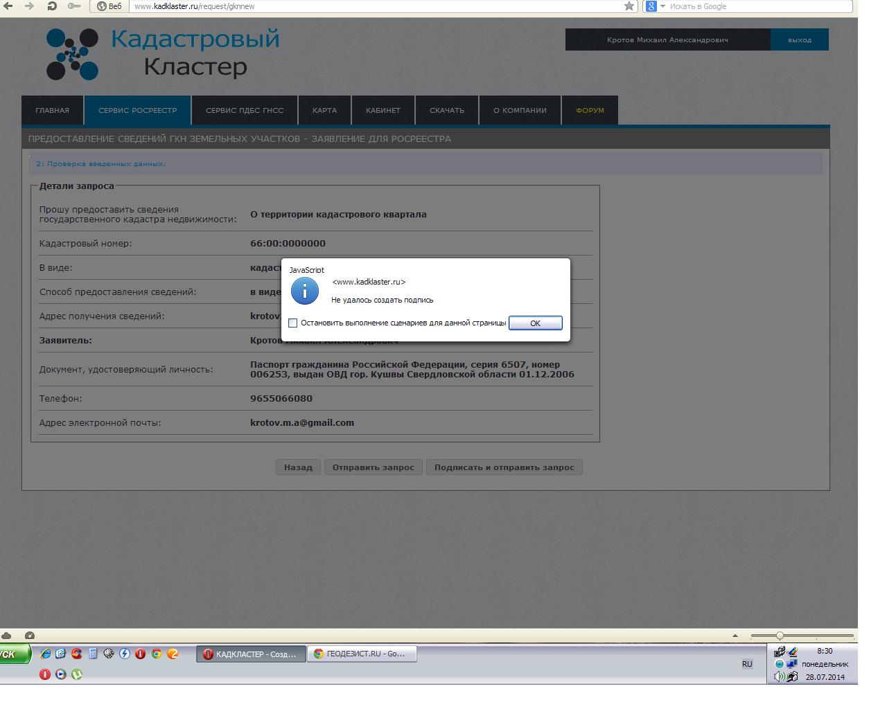 Здравствуйте! Не подписывает заявление на последнем этапе. Пробовал и доп. документ прилагать, и новое заявление создавал, пишет: "Подпись не создана". Проверял на соответствие sig-файл, пишет, что сертификат действителен. И еще, работаю в браузере Chrome, иногда он, видимо, пытается подгрузить плагин, и не может, из-за этого браузер зависает и приходится перезагружать. Кэш очистил, не помогло...