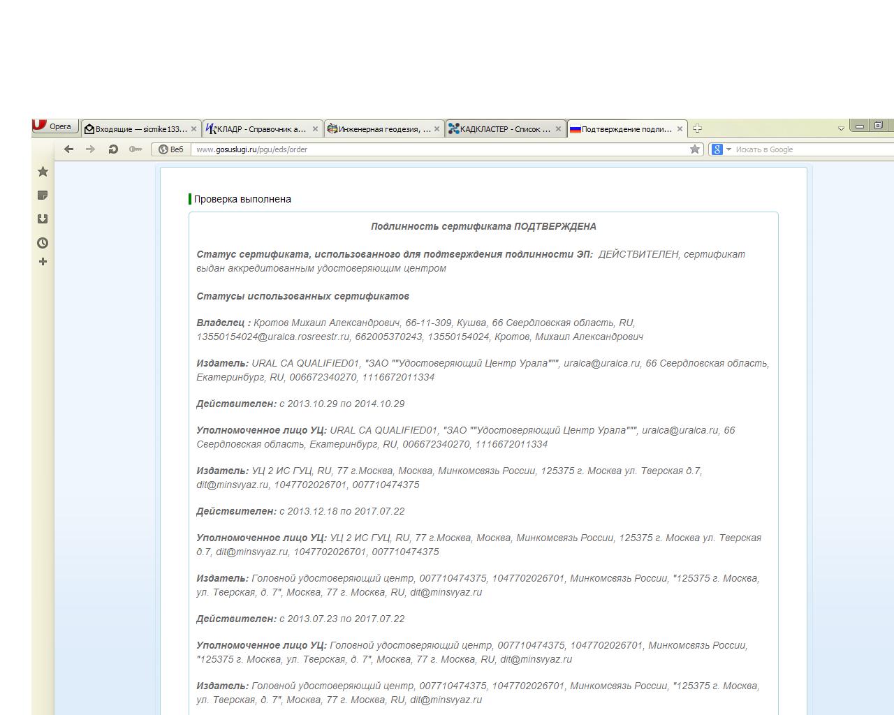 При отправке доп. документа к тех плану выдает: Проверка не пройдена. Комментарий: Ошибка при проверке электронной цифровой подписи. Обратитесь, пожалуйста, к Администрации интернет-портала государственных услуг, оказываемых Росреестром в электронном виде. Сертификат не удовлетворяет требованиям к форме квалифицированного сертификата. Сертификат содержит поле Subject записанное в неправильном формате.