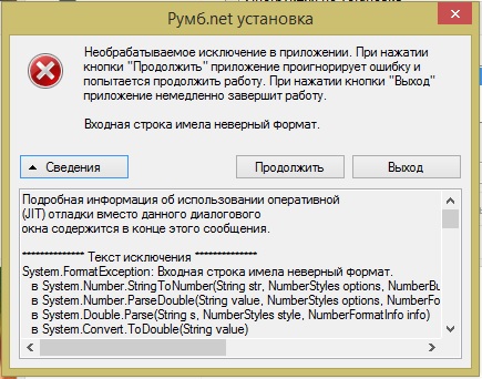************** Текст исключения ************** System.FormatException: Входная строка имела неверный формат. в System.Number.StringToNumber(String str, NumberStyles options, NumberBuffer& number, NumberFormatInfo info, Boolean parseDecimal) в System.Number.ParseDouble(String value, NumberStyles options, NumberFormatInfo numfmt) в System.Double.Parse(String s, NumberStyles style, NumberFormatInfo info) в System.Convert.ToDouble(String value) в KadKlasterInistall.InistallRumb.Inistall_Click(Object sender, EventArgs e) в System.Windows.Forms.Control.OnClick(EventArgs e) в System.Windows.Forms.Button.OnMouseUp(MouseEventArgs mevent) в System.Windows.Forms.Control.WmMouseUp(Message& m, MouseButtons button, Int32 clicks) в System.Windows.Forms.Control.WndProc(Message& m) в System.Windows.Forms.ButtonBase.WndProc(Message& m) в System.Windows.Forms.Button.WndProc(Message& m) в System.Windows.Forms.Control.ControlNativeWindow.WndProc(Message& m) в System.Windows.Forms.NativeWindow.Callback(IntPtr hWnd, Int32 msg, IntPtr wparam, IntPtr lparam)