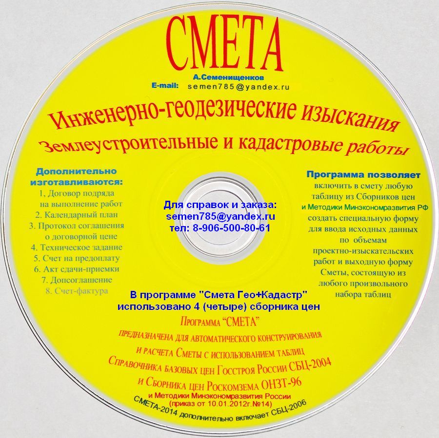 1) Программа "Смета Гео+Кадастр" учитывает 4 сборника цен для расчета стоимости геодезических, кадастровых и землеустроительных работ, стоимость=3000 руб. 2) Программа "Смета-техплан (БТИ-12)" (техническое обследование для изготовления технического плана, стоимость=990 руб. 3) Программа "Смета-планировка" (проект планировки, межевания град.план), стоимость=1400 руб.